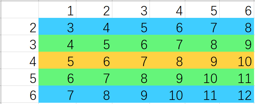 然后加入第三个骰子,将前两个骰子点数之和的所有情况作为行坐标(假设s1=s2=3),第三个骰子的点数作为列坐标: