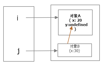 最终,先是j 指针新对象B, 而这个操作返回的引用,又指向了原 j 中的y属性,也就是对象A