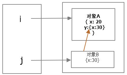 结果就是 i 为 { x:20, y: {x:30}}; j为{x:30}