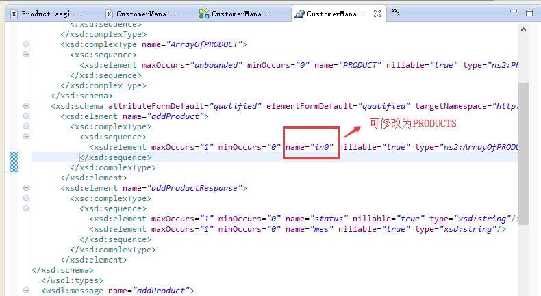 右键逻辑构件(构件名称为CustomerManagement.componentType),生成Web Service,而生成的wsdl文件时,如果生成后的节点显示为in0,in1,可修改生成后的wsdl为指定名称,如下例子由in0修改为PRODUCTS,访问的节点也会随机改变