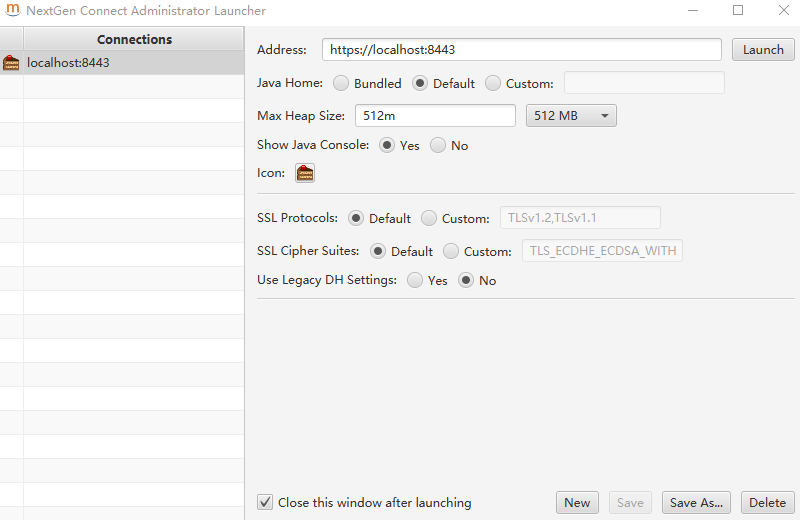 6.初次安装默认用户名为:admin,密码为:admin 。从Mirth Connect 3.7开始推荐使用新工具Mirth Connect Administrator Launcher来启动https://localhost:8443地址以运行Mirth Connect Administrator来进行信道操作。