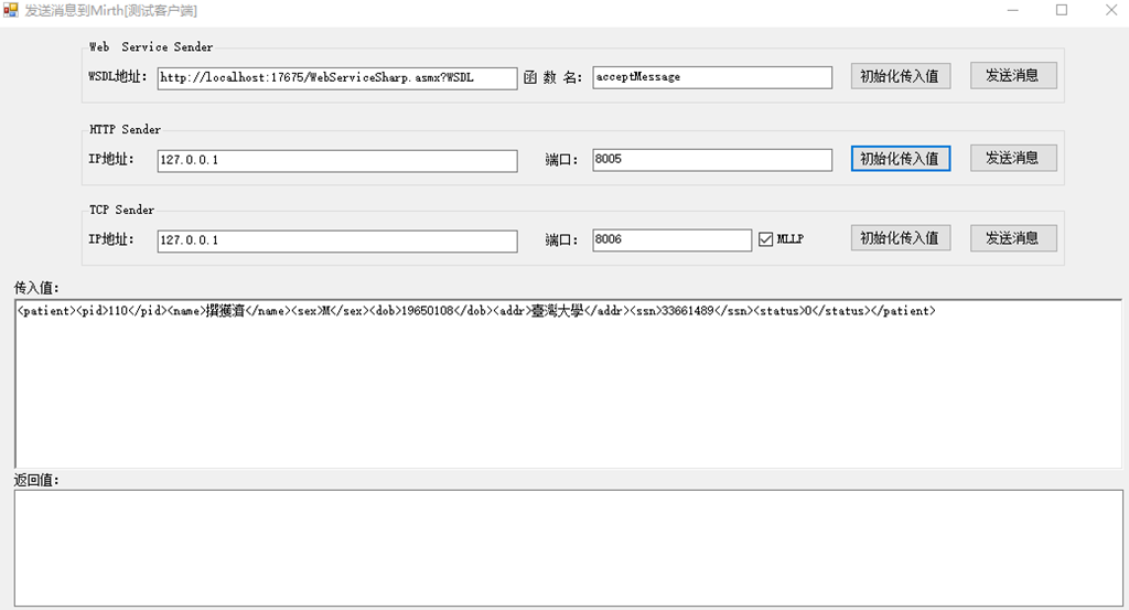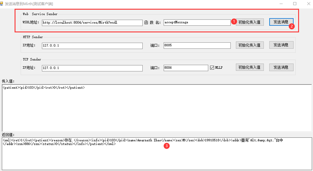 运行C#版Web Service Sender,进行如上测试,成功获取响应,验证Mirth Connect 的Web Service Listener信道OK!