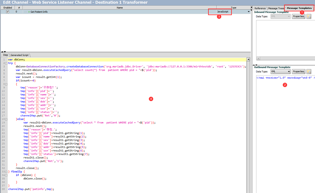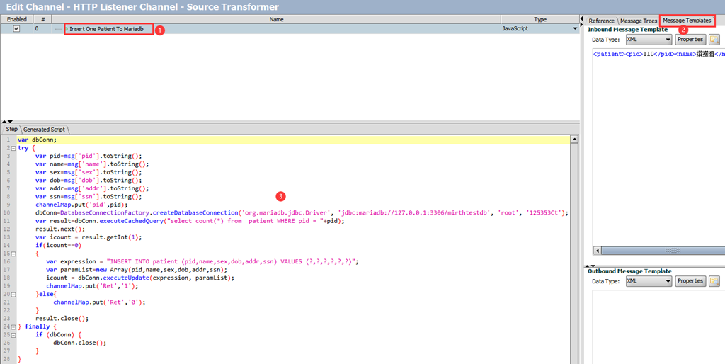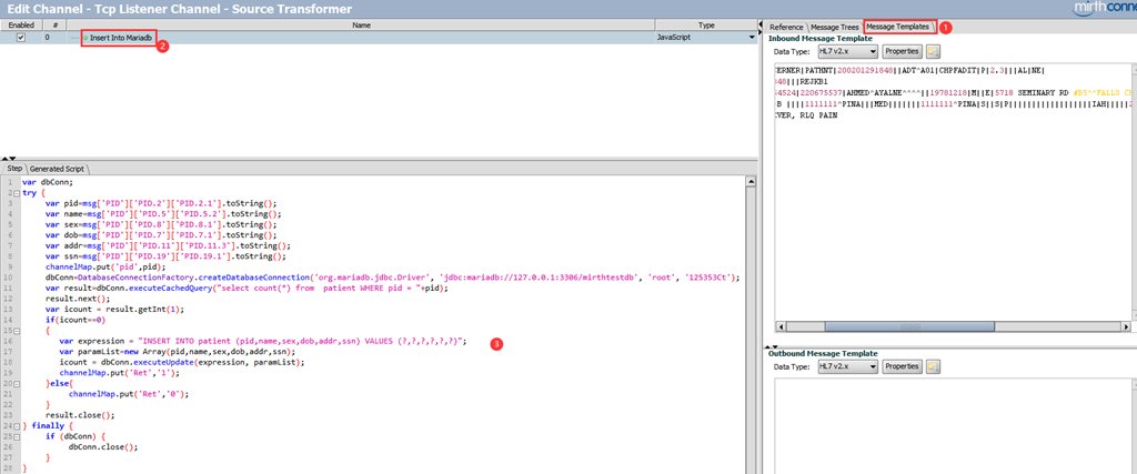 dbConn=DatabaseConnectionFactory.createDatabaseConnection('org.mariadb.jdbc.Driver', 'jdbc:mariadb://127.0.0.1:3306/mirthtestdb', 'root', '125353Ct');