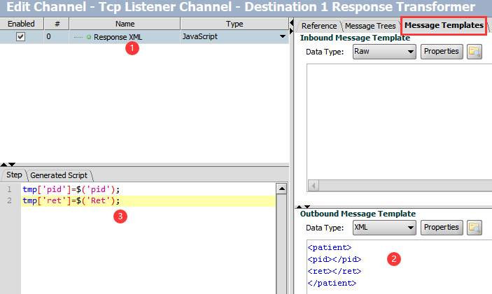 目的端转换规则;在‘输出消息模板’中录入如下xml格式模板并添加如下js脚本