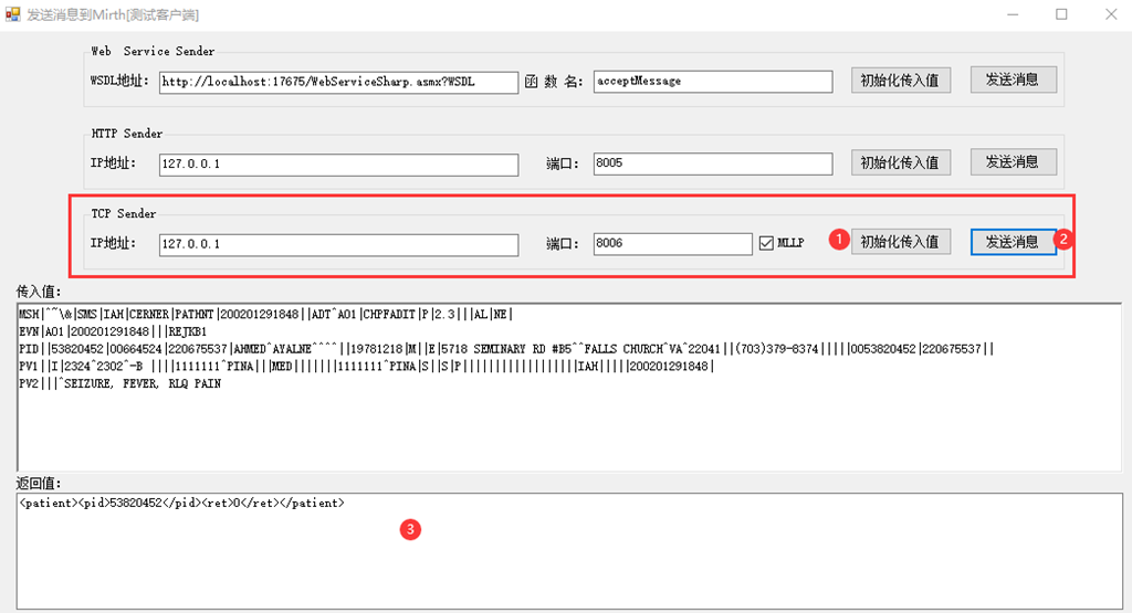 运行C#版TCP Sender,进行如上测试,成功获取响应,验证Mirth Connect 的TCP Listener信道OK!