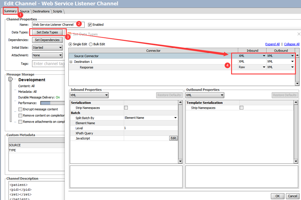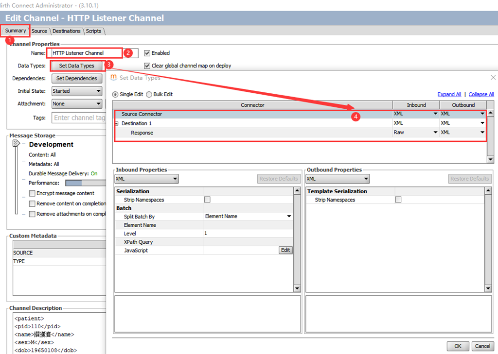 新建信道并设置源端输入输出参数格式、目的端输入输出格式、响应输入输出参数格式