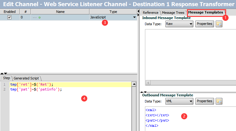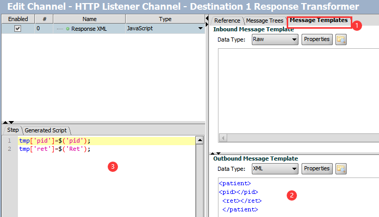 目的端响应转换规则;在‘输出消息模板’中录入如下xml格式模板并添加如下js脚本