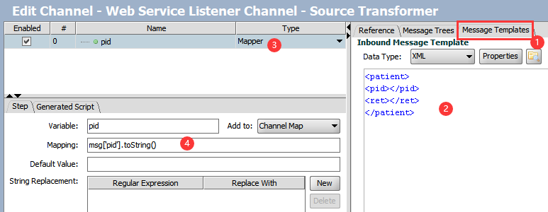 设置源端转换规则;源端新建Mapper映射转换步骤,在‘输入消息模板’录入如下XML消息模板