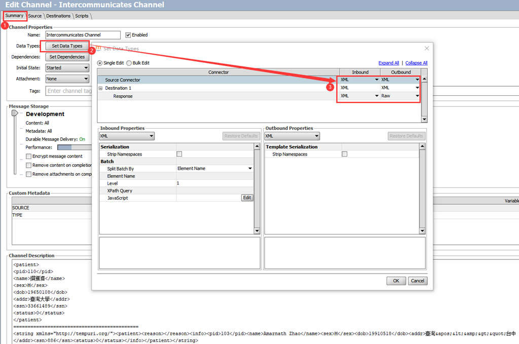 系统A发送XML格式患者信息到Mirth的Source端HTTP Listener,完成患者信息入库逻辑;然后Mirth的Destinations端Web Service Sender调用系统B开放的C#实现的Webservice接口服务完成患者信息的查询并把响应结果返回给最初调用者系统A。这个数据交互通讯过程涉及:系统A---->Mirth---->系统B---->Mirth---->系统A