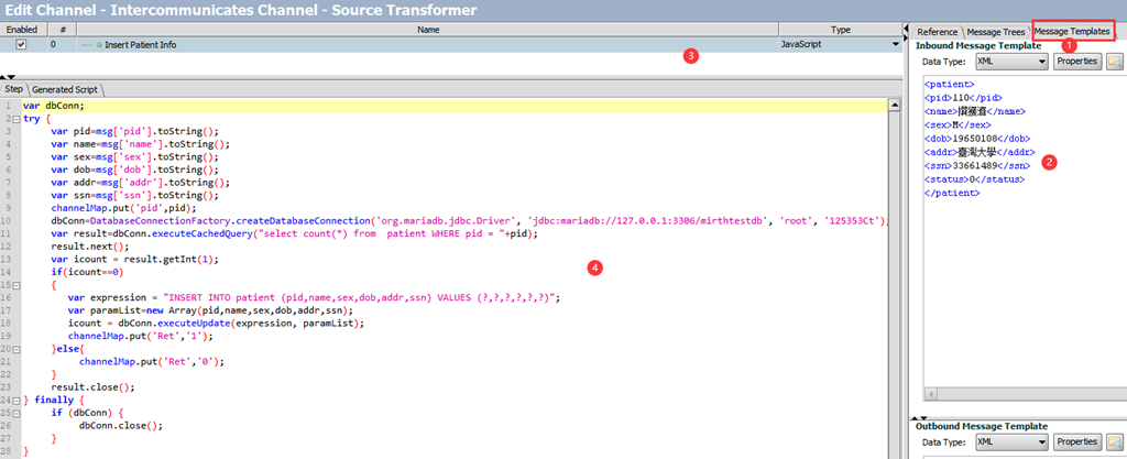 设置源端转换规则;源端新建JS转换步骤,在‘输入消息模板’录入如下XML消息模板并添加如下js脚本完成患者信息入库逻辑