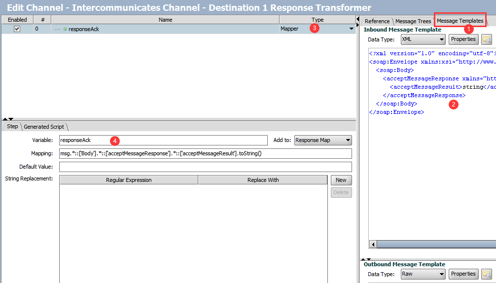 输入C# Webservice接口响应消息作为响应‘输入参数模板’,对返回值映射到Response Map的自定义变量responseAck中