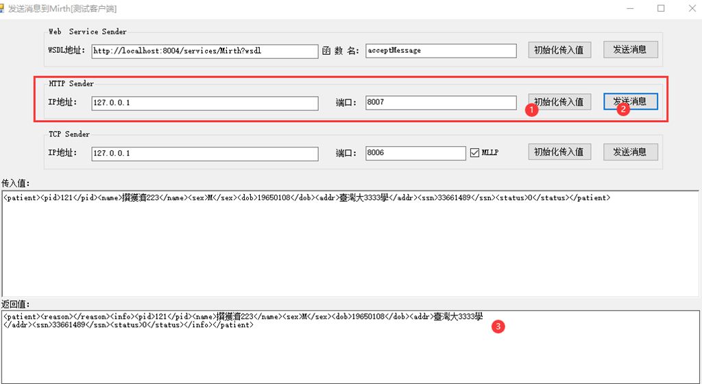 运行C#版HTTP Sender,进行如上测试,成功获取响应,验证Mirth Connect 的HTTP Listener源通道、Web Service Sender目标通道与C# Webservice接口服务双向交互通讯OK!