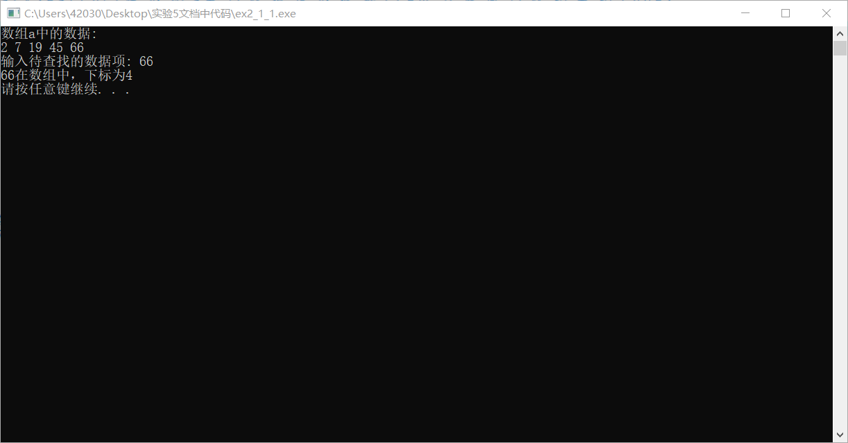 // 练习:使用二分查找,在一组有序元素中查找数据项 // 形参是数组,实参是数组名 #include <stdio.h> #include <stdlib.h> const int N=5; int binarySearch(int x[], int n, int item); // 函数声明 int main() { int a[N]={2,7,19,45,66}; int i,index, key; printf("数组a中的数据:\n"); for(i=0;i<N;i++) printf("%d ",a[i]); printf("\n"); printf("输入待查找的数据项: "); scanf("%d", &key); // 调用函数binarySearch()在数组a中查找指定数据项item,并返回查找结果给index // 补足代码① index=binarySearch(a,N,key); if(index>=0) printf("%d在数组中,下标为%d\n", key, index); else printf("%d不在数组中\n", key); system("pause"); return 0; } //函数功能描述: //使用二分查找算法在数组x中查找特定值item,数组x大小为n // 如果找到,返回其下标 // 如果没找到,返回-1 int binarySearch(int x[], int n, int item) { int low, high, mid; low = 0; high = n-1; while(low <= high) { mid = (low+high)/2; if (item == x[mid]) return mid; else if(item==x[low]) high = mid - 1; else low = mid + 1; } return -1; }
