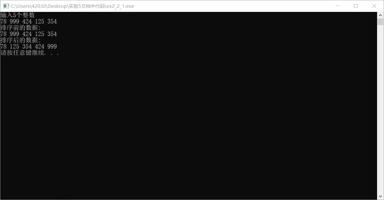 // 示例: 使用选择法排序对一组整数由小到大排序 #include <stdio.h> #include <stdlib.h> const int N=5; void selectSort(int [], int); // 函数声明(函数声明中可以省略变量名、数组名) void input(int [], int); void output(int [], int); int main() { int a[N]; printf("输入%d个整数\n", N); input(a, N); printf("排序前的数据:\n"); output(a,N); selectSort(a,N); // 调用selectSort()对数组a中的N个元素排序 printf("排序后的数据:\n"); output(a, N); system("pause"); return 0; } // 函数定义 // 函数功能描述:输入n个整数到数组a中 void input(int a[], int n) { int i; for(i=0; i<n; i++) scanf("%d", &a[i]); } // 函数定义 // 函数功能描述:输出数组a中的n个整数 void output(int a[], int n) { int i; for(i=0; i<n; i++) printf("%d ", a[i]); printf("\n"); } // 函数定义 // 函数功能描述:使用选择法对数组a中的n个整数由小到大排序 void selectSort(int a[], int n) { int i, j, k, temp;
