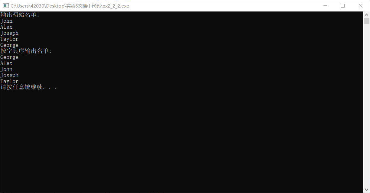 // 练习:使用选择法对字符串按字典序排序 #include <stdio.h> #include <string.h> #include <stdlib.h> void selectSort(char str[][20], int n ); // 函数声明,形参str是二维数组名 int main() { char name[][20] = {"John", "Alex", "Joseph", "Taylor", "George"}; int i; printf("输出初始名单:\n"); for(i=0; i<5; i++) printf("%s\n", name[i]); selectSort(name, 5); // 调用选择法对name数组中的字符串排序 printf("按字典序输出名单:\n"); for(i=0; i<5; i++) printf("%s\n", name[i]); system("pause"); return 0; } // 函数定义 // 函数功能描述:使用选择法对二维数组str中的n个字符串按字典序排序 void selectSort(char str[][20], int n) { int i,j,k; char temp[20]; for(i=0; i<n-1; i++) { k = i; for(j=i+1; j<n; j++){ if (strcmp(str[j],str[i])<0) k = j; } if(k != i) { strcpy(temp,str[i]); strcpy(str[i],str[k]); strcpy(str[k],temp); } } }