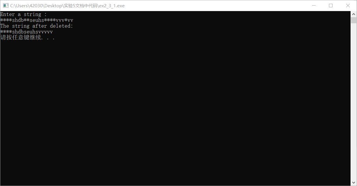 /* 假定输入的字符串中只包含字母和*号。 编写函数,实现: 除了字符串前导和尾部的*号之外,将串中其他*号全部删除。 在编写函数时,不得使用C语言提供的字符串函数。 例如,若字符串中的内容为****A*BC*DEF*G******* 删除后,字符串中的内容则应当是****ABCDEFG****** */ #include <stdio.h> #include <stdlib.h> #include <string.h> void fun(char *a) { /**ERROR******/ int i=0; char *t = a, *f = a; char *q = a; while(*t) t++; t--; while(*t == '*') t--; while(*f == '*') f++; /***ERROR***/ while (q<f) { a[i] = *q; q++; i++; } while (q<t) { /***ERROR**/ if(*q!= '*') { a[i] = *q; i++; } q++; } while (*q) { a[i] = *q; i++; q++; } /**ERROR**/ a[i]=0; } int main () { char s[81]; printf("Entre a string:\n"); gets(s); /**ERROR**/ fun(s); printf("The sting after deleted:\n"); puts(s); system("pause"); return 0; }
