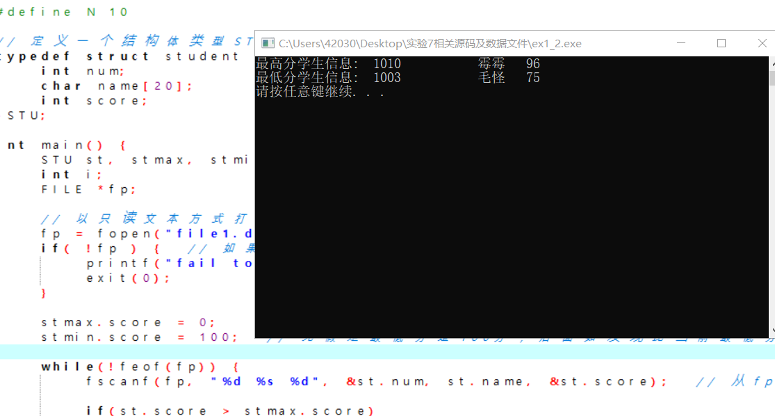 #include <stdio.h> #include <stdlib.h> #include <string.h> const int N = 10; // 定义结构体类型struct student,并定义其别名为STU typedef struct student { long int id; char name[20]; float objective; /*客观题得分*/ float subjective; /*操作题得分*/ float sum; char level[10]; }STU; // 函数声明 void input(STU s[], int n); void output(STU s[], int n); void process(STU s[], int n); int main() { STU stu[N]; printf("录入%d个考生信息: 准考证号,姓名,客观题得分(<=40),操作题得分(<=60)\n", N); input(stu, N); printf("\n对考生信息进行处理: 计算总分,确定等级\n"); process(stu, N); printf("\n打印考生完整信息: 准考证号,姓名,客观题得分,操作题得分,总分,等级\n"); output(stu, N); system("pause"); return 0; } // 从文本文件examinee.txt读入考生信息:准考证号,姓名,客观题得分,操作题得分 void input(STU s[], int n) { FILE *fp; fp = fopen("examinee.txt", "r"); if( !fp ) { printf("fail to open examinee.txt\n"); exit(0); } for(int i=0; i<N; i++) fscanf(fp, "%ld %s %f %f", &s[i].id, &s[i].name, &s[i].objective, &s[i].subjective); fclose(fp); } // 输出考生完整信息: 准考证号,姓名,客观题得分,操作题得分,总分,等级 // 不仅输出到屏幕上,还写到文本文件result.txt中 void output(STU s[], int n) { FILE *fout; fout = fopen("result.txt", "w"); if( !fout ) { // 如果打开失败,则输出错误提示信息,然后退出程序 printf("fail to open result.txt\n"); exit(0); } /* 将排序后的数组st中数据输出到屏幕,同时,也写入文件result.txt*/ for(int i=0; i<N; i++) { printf("%-6ld%-10s%7.2f %7.2f %7.2f%-15s%\n", s[i].id, s[i].name, s[i].objective, s[i].subjective, s[i].sum, s[i].level); fprintf(fout, "%-6ld%-10s %7.2f %7.2f %7.2f%-15s%\n", s[i].id, s[i].name, s[i].objective, s[i].subjective, s[i].sum, s[i].level); } fclose(fout); } // 对考生信息进行处理:计算总分,排序,确定等级 void process(STU s[], int n) { int i,k; for(i=0;i<n;i++) s[i].sum=s[i].objective+s[i].subjective; STU temp; for(k=n-1;k--;) for(i=0;i<n-1;i++) if(s[i].sum<s[i+1].sum) { temp=s[i]; s[i]=s[i+1]; s[i+1]=temp; } for(i=0;i<n;i++) { if(i<n/10) strcpy(s[i].level,"优秀"); else if(i>=n/10&&i<=4*N/10) strcpy(s[i].level,"合格"); else strcpy(s[i].level,"不合格"); } }