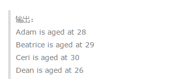 4 print("%s is aged at %d" % (record['Name'], record['Age']))