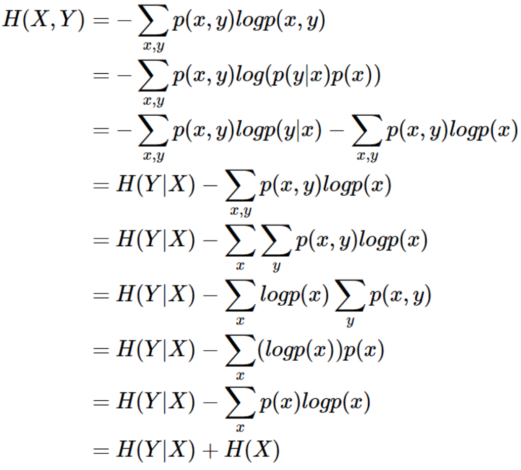 条件熵 𝐻(𝑌|𝑋) 相当于联合熵 𝐻(𝑋,𝑌) 减去单独的熵 𝐻(𝑋),即 𝐻(𝑌|𝑋)=𝐻(𝑋,𝑌)−𝐻(𝑋),证明如下: