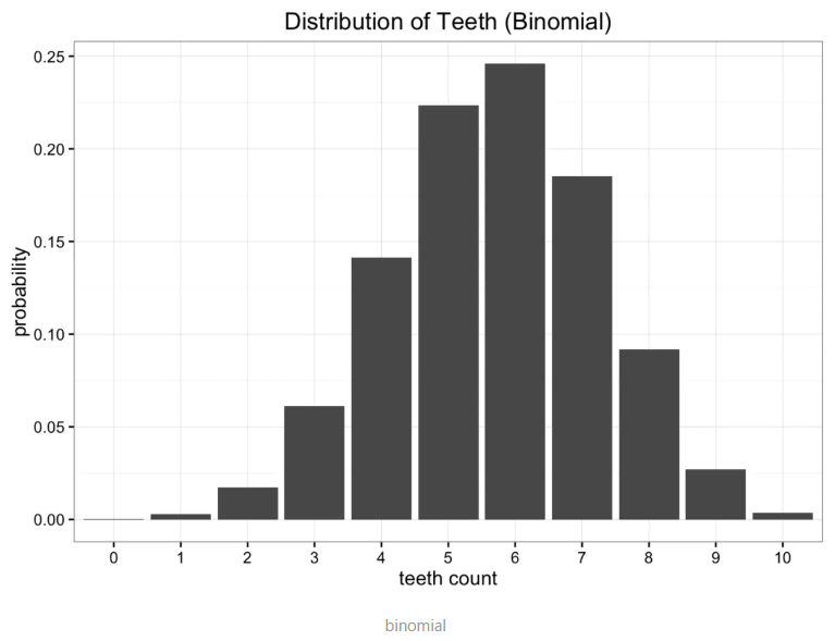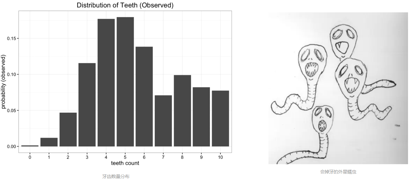 假设我们是一群太空科学家,经过遥远的旅行,来到了一颗新发现的星球。在这个星球上,生存着一种长有牙齿的蠕虫,引起了我们的研究兴趣。我们发现这种蠕虫生有10颗牙齿,但是因为不注意口腔卫生,又喜欢嚼东西,许多蠕虫会掉牙。收集大量样本之后,我们得到关于蠕虫牙齿数量的经验分布,如下图所示: