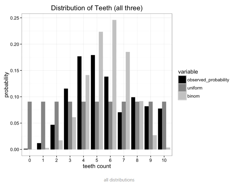 二项式分布binomial distribution。蠕虫嘴里面共有n=10个牙槽,每个牙槽出现牙齿与否为独立事件,且概率均为p。则蠕虫牙齿数量即为期望值E[x]=n*p,真实期望值即为观察数据的平均值,比如说5.7,则p=0.57,得到如下图所示的二项式分布: