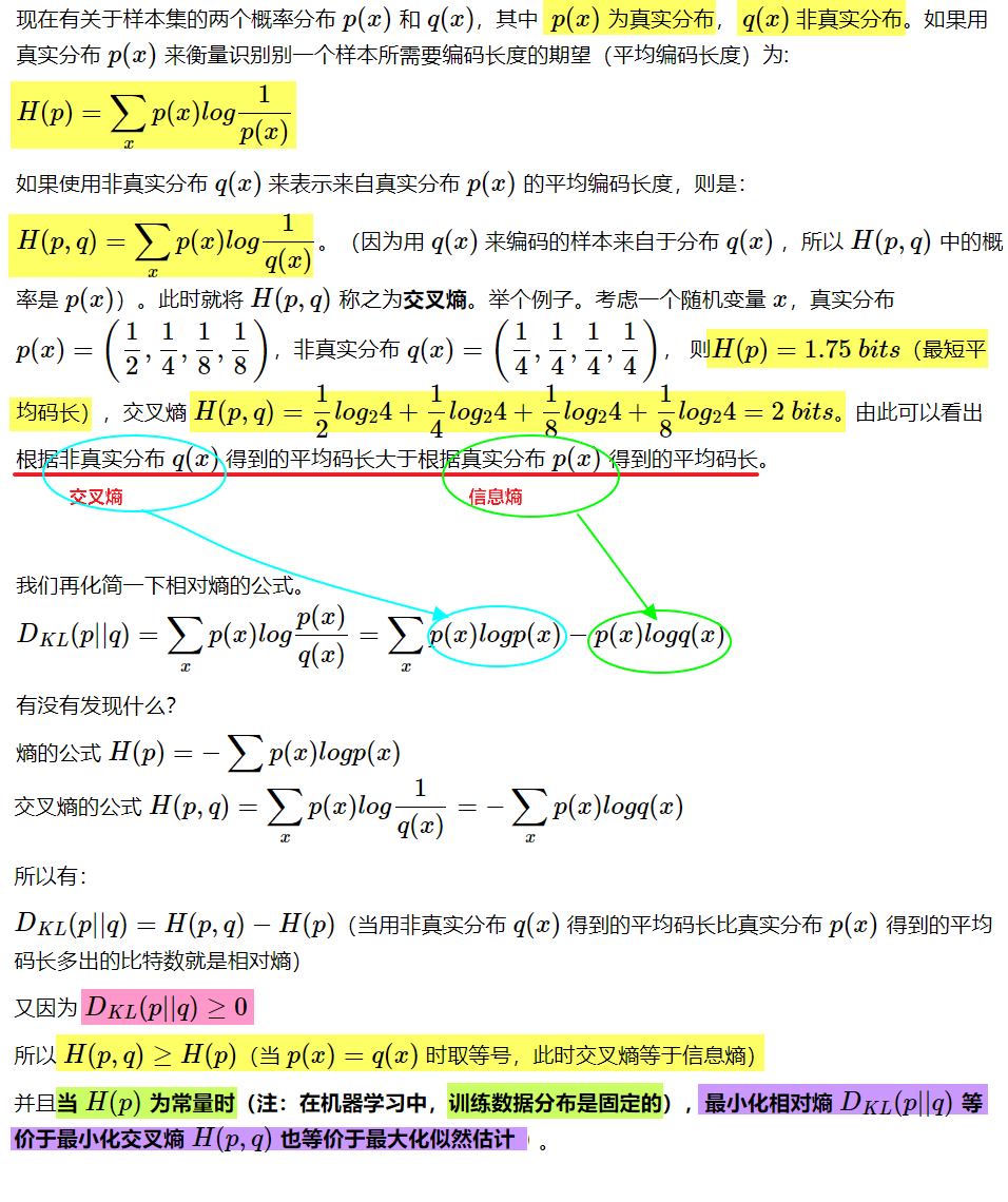 信息熵:由信息量的概念引出信息熵,首先要知道信息量的公式的由来(4点推导出),某个事件的信息量就是 这个事件发生的负对数。而信息熵是跟所有可能性有关系的。每个可能事件的发生都有个概率。信息熵就是平均而言,发生一个时间我们可以得到的信息量的大小。所以从数学上看,信息熵其实是信息量的期望(公式详见正文)。