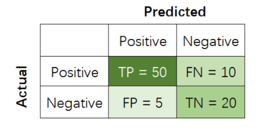 - 称预测类别为1的为Positive(阳性),预测类别为0的为Negative(阴性)。