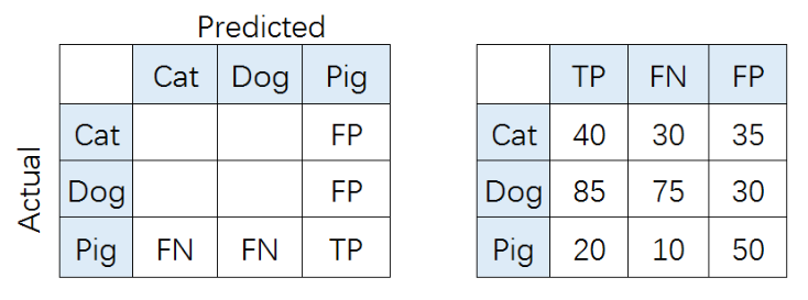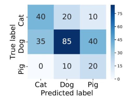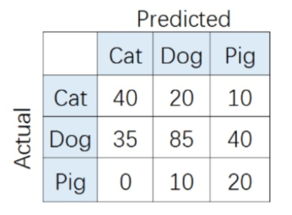 在多分类(大于两个类)问题中,假设我们要开发一个动物识别系统,来区分输入图片是猫,狗还是猪。给定分类器一堆动物图片,产生了如下结果混淆矩阵。