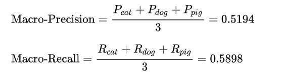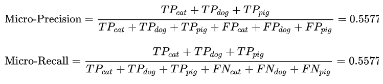 这是因为在某一类中的False Positive样本,一定是其他某类别的False Negative样本。听起来有点抽象?举个例子,比如说系统错把「狗」预测成「猫」,那么对于狗而言,其错误类型就是False Negative,对于猫而言,其错误类型就是False Positive。于此同时,Micro-precision和Micro-recall的数值都等于Accuracy,因为它们计算了对角线样本数和总样本数的比值,总结就是: