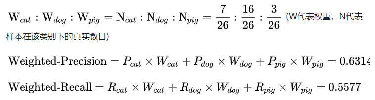 该方法给不同类别不同权重(权重根据该类别的真实分布比例确定),每个类别乘权重后再进行相加。该方法考虑了类别不平衡情况,它的值更容易受到常见类(majority class)的影响。