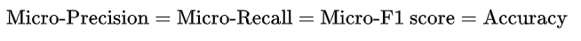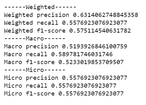 print('------Weighted------') print('Weighted precision', precision_score(y_true, y_pred, average='weighted')) print('Weighted recall', recall_score(y_true, y_pred, average='weighted')) print('Weighted f1-score', f1_score(y_true, y_pred, average='weighted')) print('------Macro------') print('Macro precision', precision_score(y_true, y_pred, average='macro')) print('Macro recall', recall_score(y_true, y_pred, average='macro')) print('Macro f1-score', f1_score(y_true, y_pred, average='macro')) print('------Micro------') print('Micro precision', precision_score(y_true, y_pred, average='micro')) print('Micro recall', recall_score(y_true, y_pred, average='micro')) print('Micro f1-score', f1_score(y_true, y_pred, average='micro'))