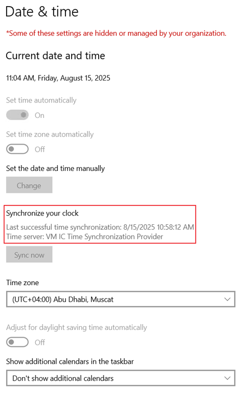 即使你在虚拟机里点 “Sync now” 灰掉了,也会在后台由 Hyper-V 服务定时同步,不依赖