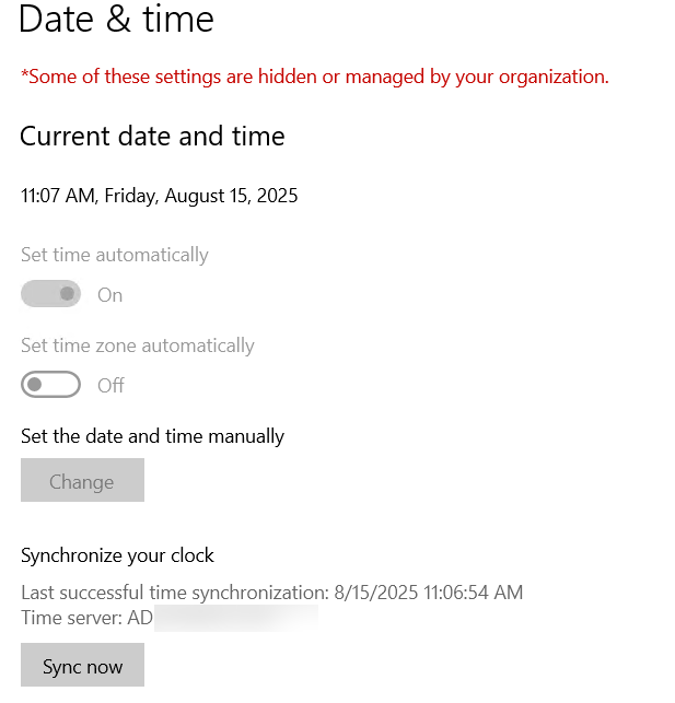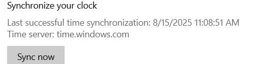 “Time server” 应该会显示为你设置的 NTP 服务器(例如 time.windows.com