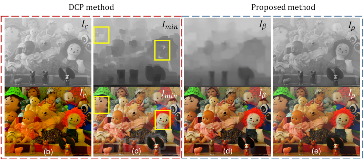 文中将本文的暗通道优化方法以流程图的形式给出,并和暗通道方法作了比较: