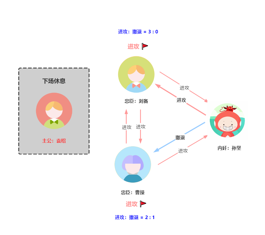 如下图所示,最后曹操、刘备、袁绍收到的指令为进攻 2 票,撤退 1 票,按照少数服从多数原则,三个人都是发起进攻。执行了一致的作战计划,保证作战的胜利。