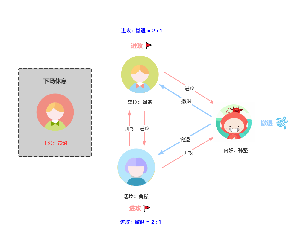 第一轮孙坚向其中一个副官袁绍发送撤退指令,向另外两个副官曹操、刘备发送进攻指令。那么第一轮的结果如下图:
