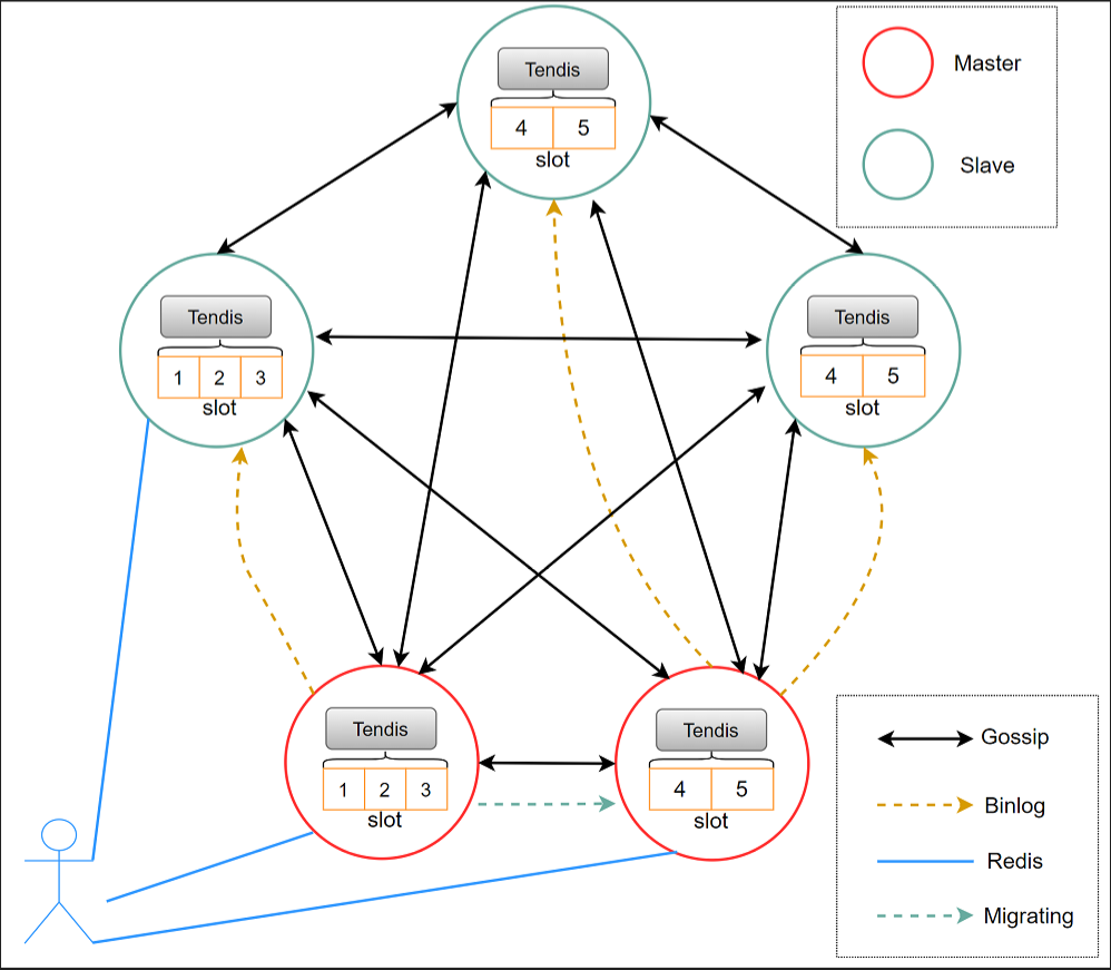 每个Tendis节点维护各自的slot数据,任意两个master节点之间的slot不重复,master节点之间支持基于slot的数据搬迁,主备节点之间通过binlog实现数据复制。