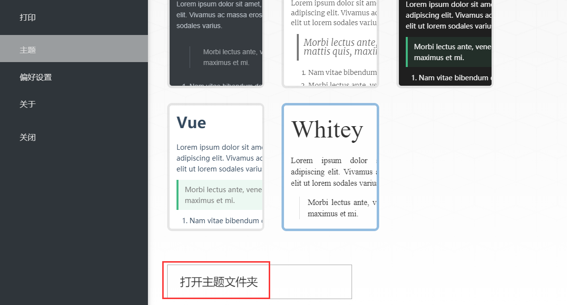 然后打开typora设置,依次点击 主题->打开主题文件夹,