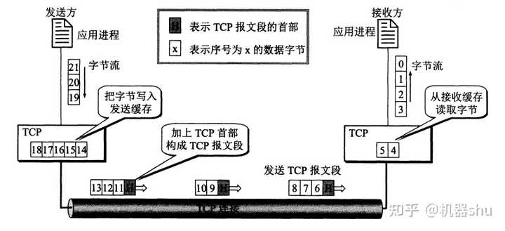 发送方发出字节流,TCP协议给它加上首部然后通过服务访问点TSAP(类似端口)传输到下一层。从一台主机发送到另一台前要进行TCP3次握手,发送结束后4次挥手。然后接受方收到数据剥去首部,将字节流传到进程里。