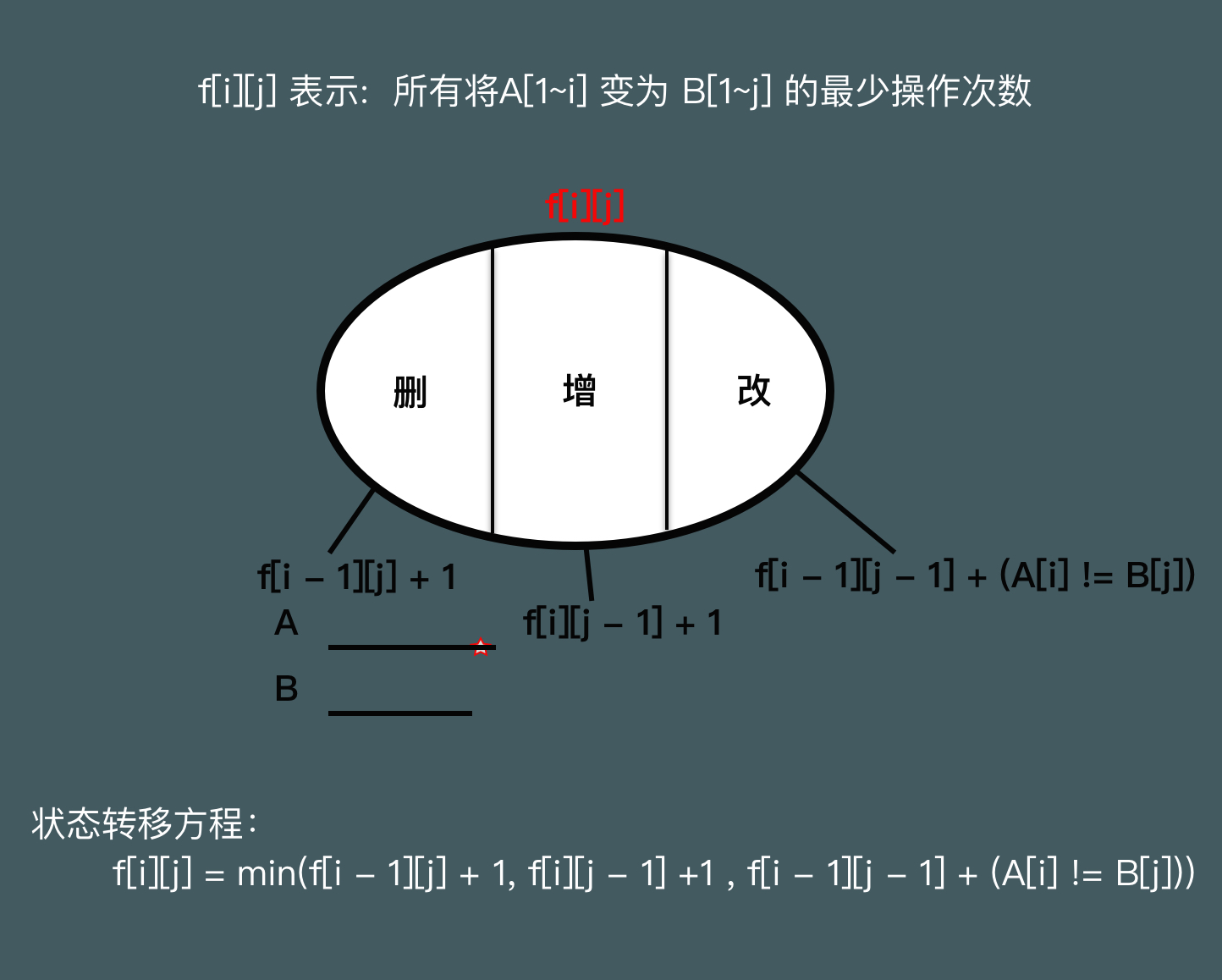 1 #include<bits/stdc++.h> 2 using namespace std; 3 4 const int N = 1010; 5 6 int n,m; 7 char a[N],b[N]; 8 int f[N][N]; //集合表示 由a[1 ~ i]变成b[1 ~ j]的操作方式 9 10 int main() 11 { 12 scanf("%d%s", &n,a + 1); 13 14 scanf("%d%s", &m,b + 1); 15 16 for (int i = 0; i <= m; i ++ ) f[0][i] = i;//b的前i个字母和a的前0个字母匹配,只能将a的前i个字母增加i次 17 for (int i = 0; i <= n; i ++ ) f[i][0] = i;//a的前i个字母和b的前零个字母匹配,只能将a个i个字母删除i次 18 19 for (int i = 1; i <= n; i ++ ) 20 for (int j = 1; j <= m; j ++ ) 21 { 22 f[i][j] = min(f[i - 1][j] + 1,f[i][j - 1] + 1);//a字符的删和增的操作 23 if(a[i] == b[j]) f[i][j] = min(f[i][j],f[i - 1][j - 1]); //a字符的修改的操作 24 else f[i][j] = min(f[i][j],f[i - 1][j - 1] + 1); 25 } 26 27 cout << f[n][m] << endl;//把a的前n个字母变成b的前m个字母 28 29 return 0; 30 }