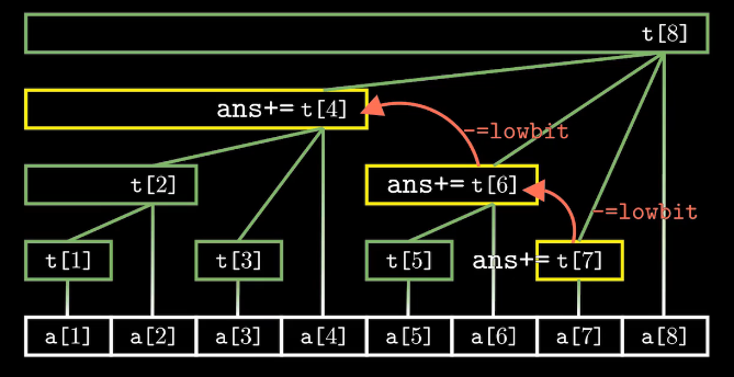 查询这个点的前缀和,需要从这个点向左上找到上一个结点,将加上其结点的值。向左上找到上一个结点,只需要将下标 x -= lowbit(x),例如 7 - lowbit(7) = 6。