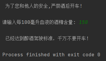 print("\n 已经达到酒后驾驶标准,请不要开车!")