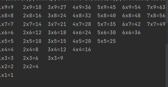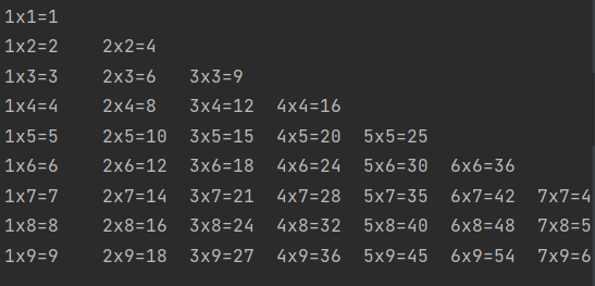 print(str(j) + "x" + str(i) + "=" + str(i * j) + "\t",end = ' ')