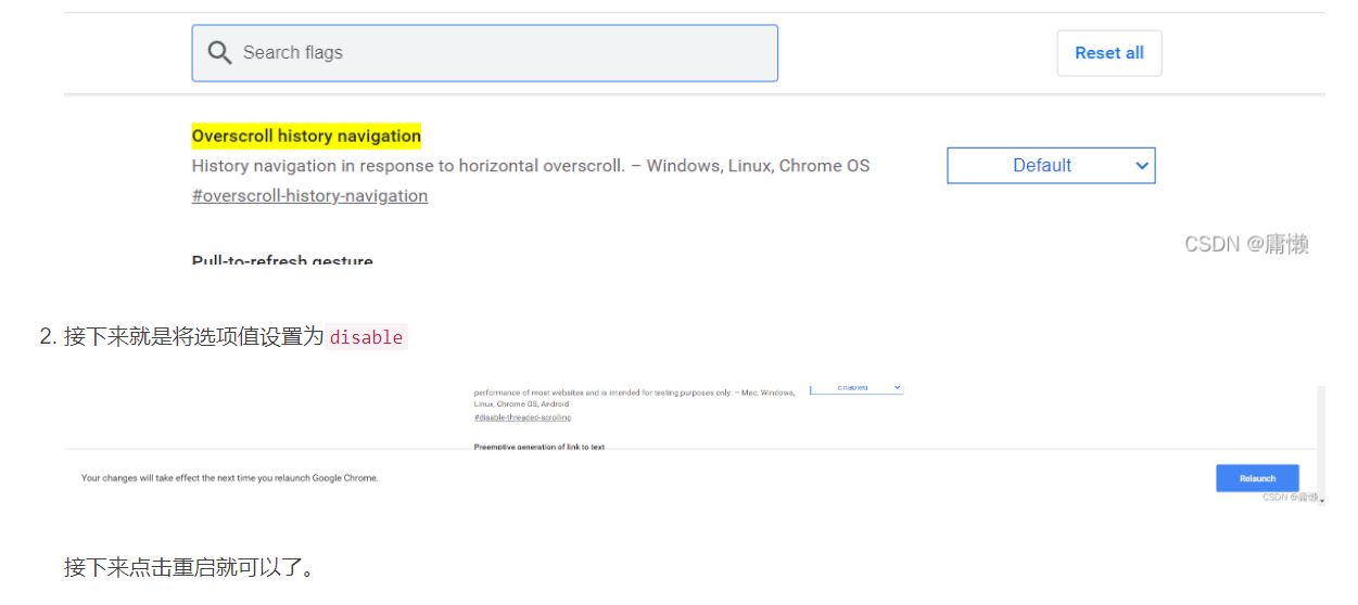 因为Chrome关闭了该项设置,虽然某些国产浏览器上会有相关设置,但是并不打算用,所以就查到了可以使用实验模式来关闭。直接在Chrome中输入chrome://flags/#overscroll-history-navigation进入对应的设置项。