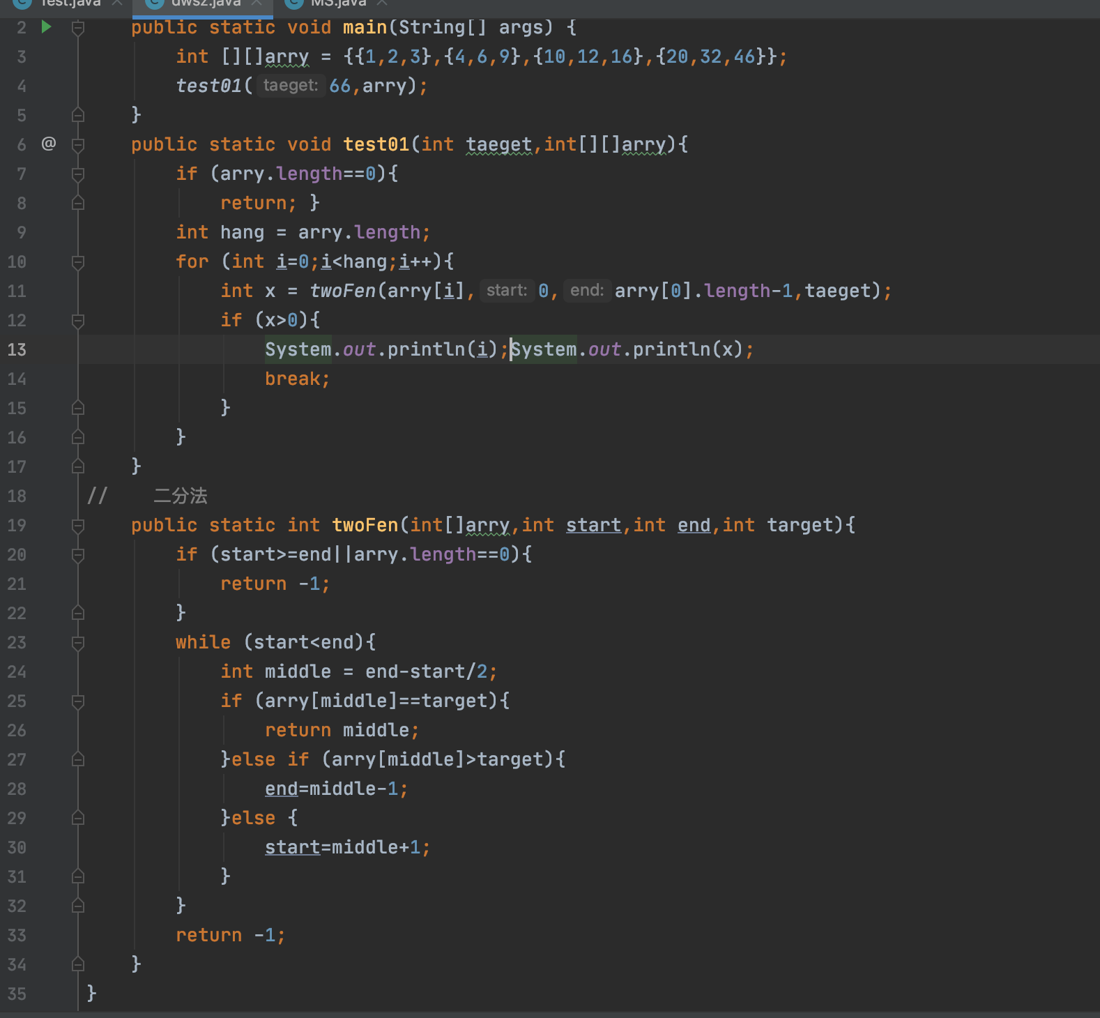 int x = twoFen(arry[i],0,arry[0].length-1,taeget);