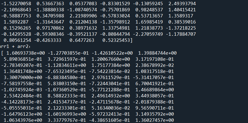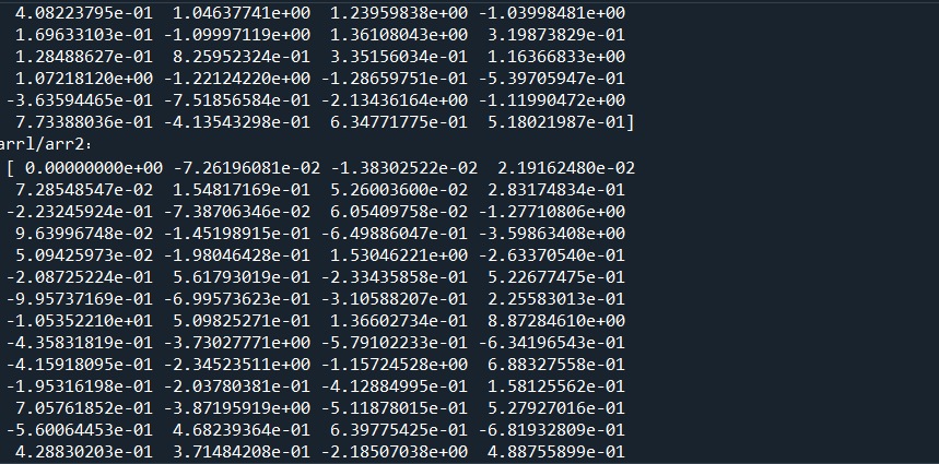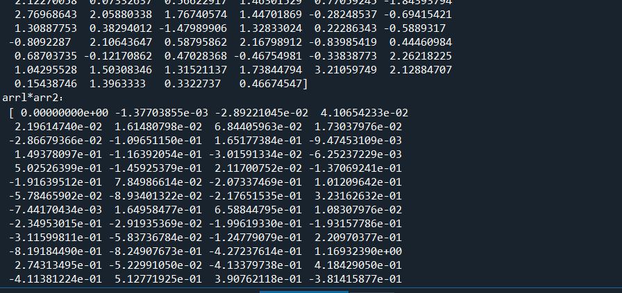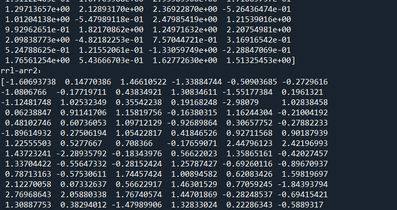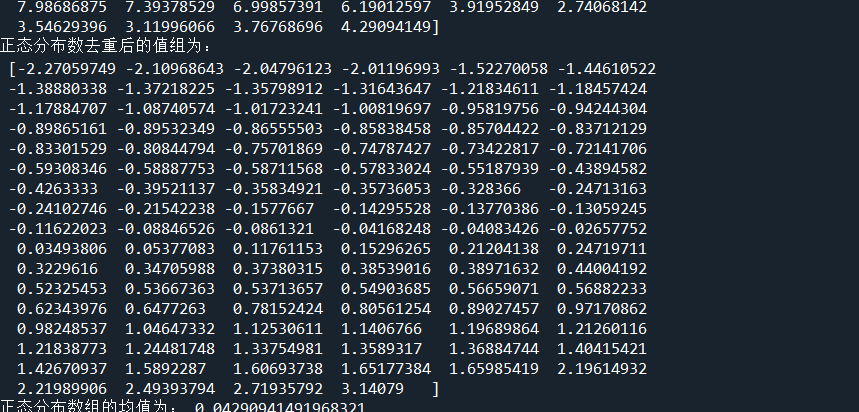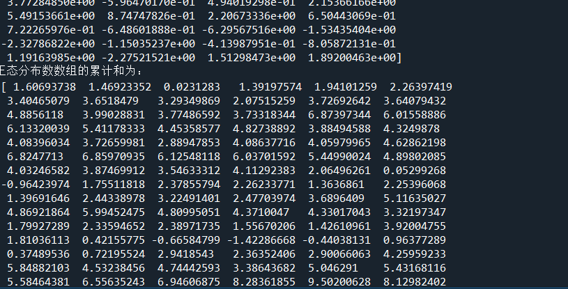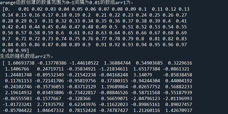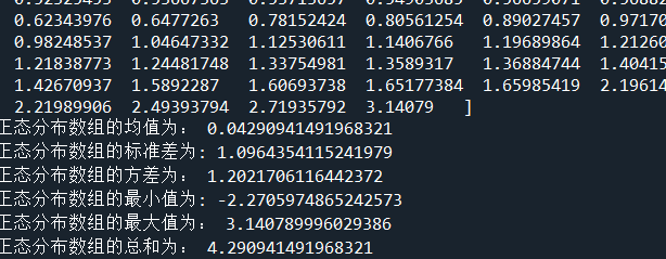 import numpy as np '''1、创建一个数值范围为0~1,间隔为0.01的数组''' arr1=np.arange(0,1,0.01) print("arange函数创建的数值范围为0~1间隔为0.01的数组arr1为:\n",arr1) '''2、创建由100个服从正态分布的随机数构成的数组''' arr2=np.random.randn(100) print('生成的服从正态分布的随机数组arr2为:\n',arr2) '''3、对创建的两个数组进行四则运算''' print('arr1 + arr2:\n',arr1+arr2) print('arrl-arr2:\n',arr1-arr2) print('arrl*arr2:\n',arr1*arr2) print('arrl/arr2:\n',arr1/arr2) '''4、对创建的数组进行简单的统计分析''' print('正态分布数数组的累计和为:\n',np.cumsum(arr2))#计算所有元素的累计和 print('正态分布数去重后的值组为:\n',np.unique(arr2))#去除重复值 print('正态分布数组的均值为:',np.mean(arr2))#计算数组均值 print('正态分布数组的标准差为:',np.std(arr2))#计算数组标准差 print('正态分布数组的方差为:',np.var(arr2))#计算数组方差 print('正态分布数组的最小值为:',np.min(arr2))#计算最小值 print('正态分布数组的最大值为:',np.max(arr2))#计算最大值 print('正态分布数组的总和为:',np.sum(arr2))#计算数组总和
