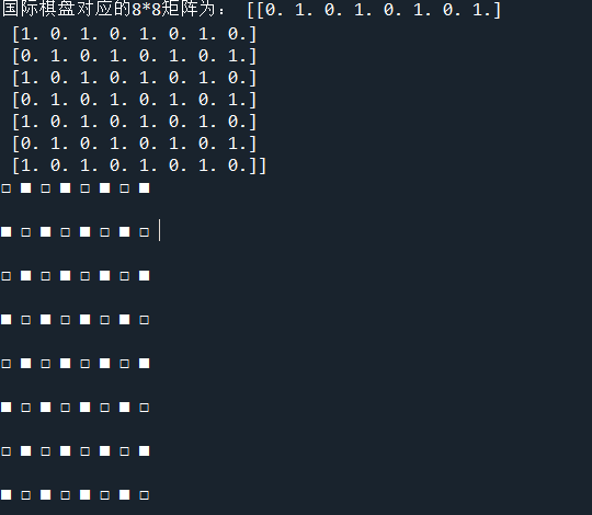 import numpy as np a=np.ones((8,8)) for i in range(8): for j in range(8): if (i+j)%2==0: a[i,j]=0 print('国际棋盘对应的8*8矩阵为:',a) for i in range(0,8): for j in range(0,8): if a[i,j]==0: print("□",end=' ') else: print("■", end=' ') print('\n')