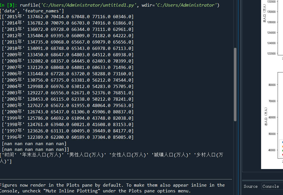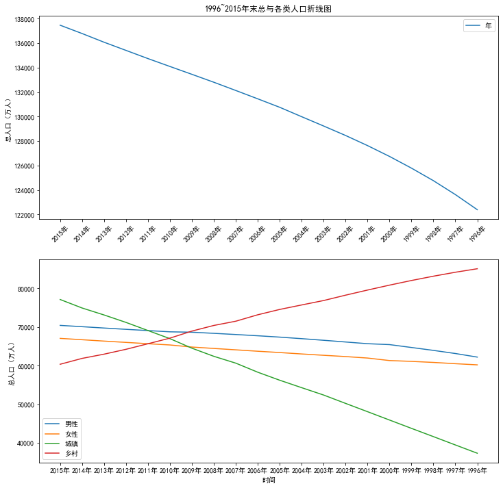 需求说明:人口数据总共拥有6个特征,分别为年末总人口、男性人口、女性人口、城镇人口、乡村人口和年份。查看各个特征随着时间推移发生的变化情况可以分析出未来男女人口比例、城乡人口变化的方向。