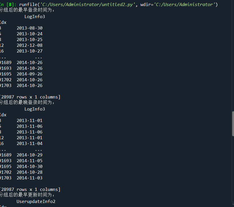 (2)使用agg方法求取分组后的最早和最晚更新及登录时间。