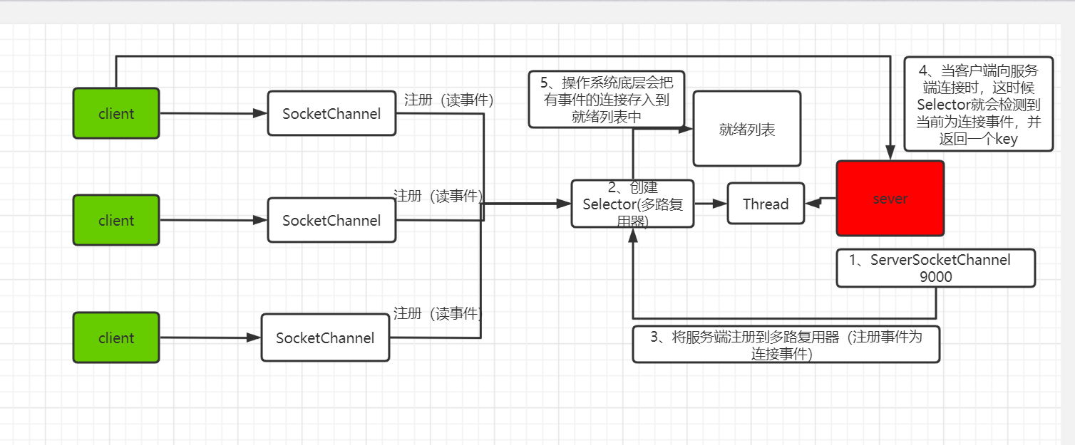 总结: 创建了一个Selector(多路复用器),服务端向Selector注册(连接事件),客户端也向Selector注册(读事件),当客户端向服务端连接时,触发了连接事件,这时底层操作系统就会把有事件的存入到就绪列表,然后判断当时连接事件,就遍历只有连接事件的客户端,进行连接,如果是读事件,那么就只读取有读事件的数据。